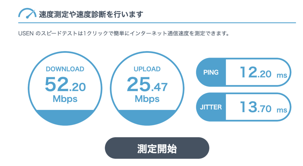 - 部屋:下り52Mbps / 上り25Mbps(計測値は出るが安定しない)