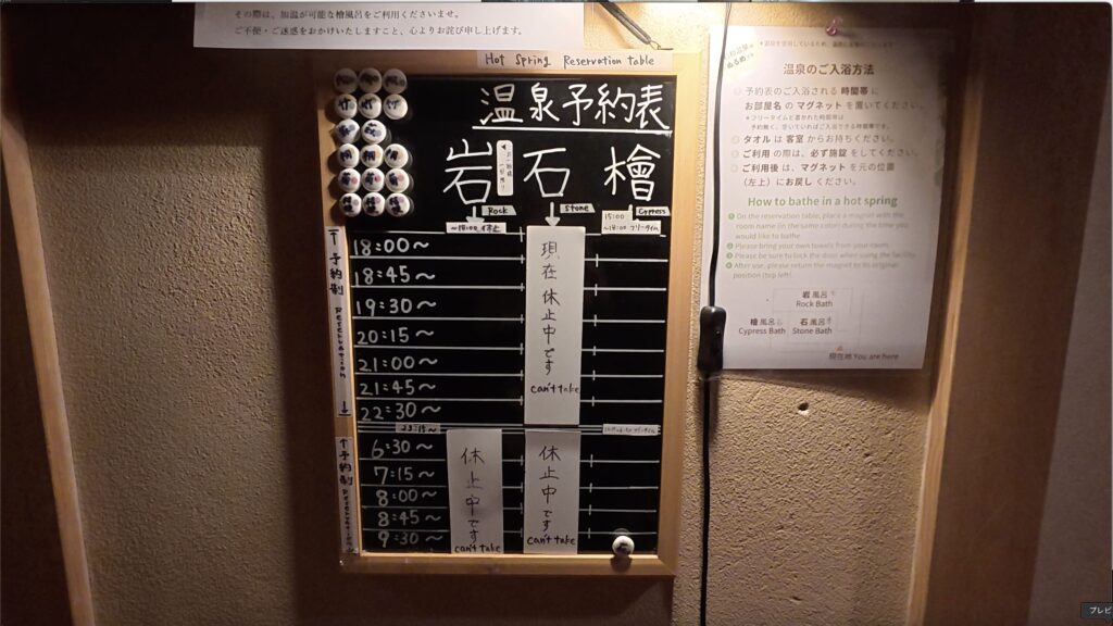 3つの温泉は全て貸切で、廊下にある予約表で自分の部屋のマグネットを置いて予約するタイプでした。