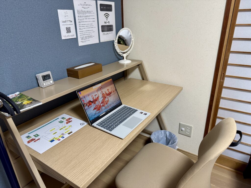 作業場所は宿の部屋で、Wi-Fiは安定・高速、静かで集中しやすい環境。